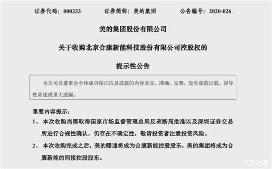 公告名称很长——《关于收购北京合康新能源科技有限公司控股权的指示性公告》。总之,美的将成为和康新能的间接控股股东,美的集团创始人何祥健将成为实际控制人。许多媒体在一次聚会上说,美的要造车!公司业务将延伸至新能源汽车产业。